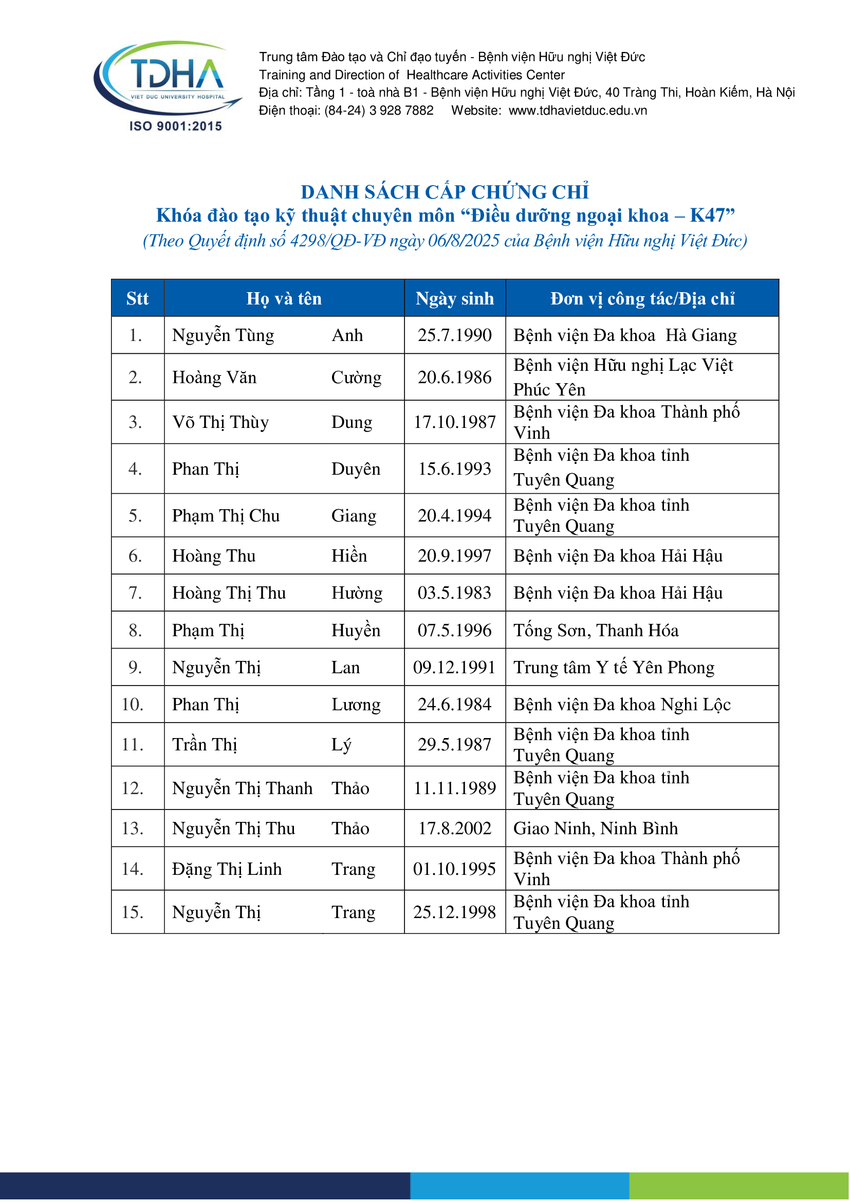Danh sách cấp chứng chỉ khóa đào tạo kỹ thuật chuyên môn Điều dưỡng ngoại khoa – K47