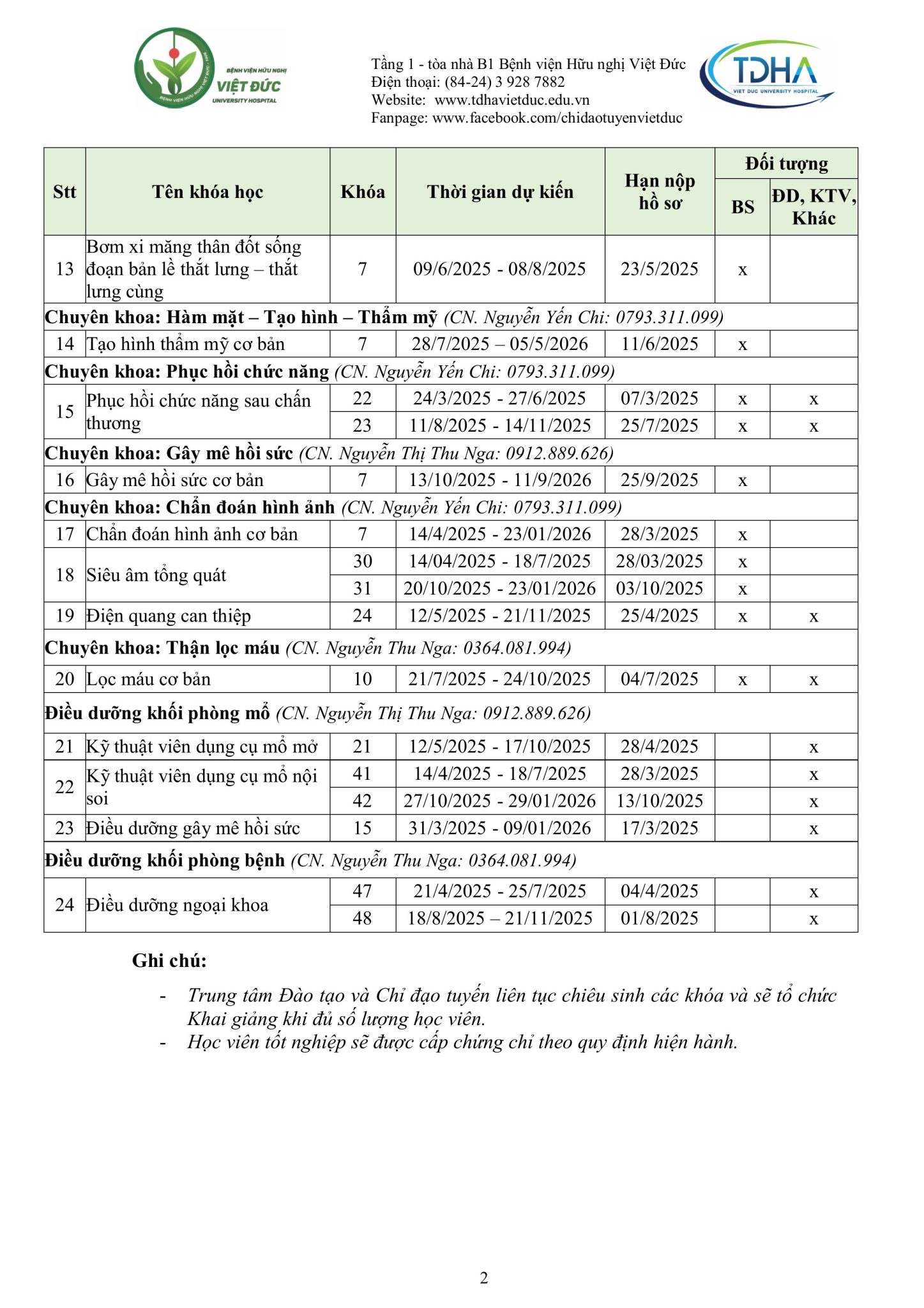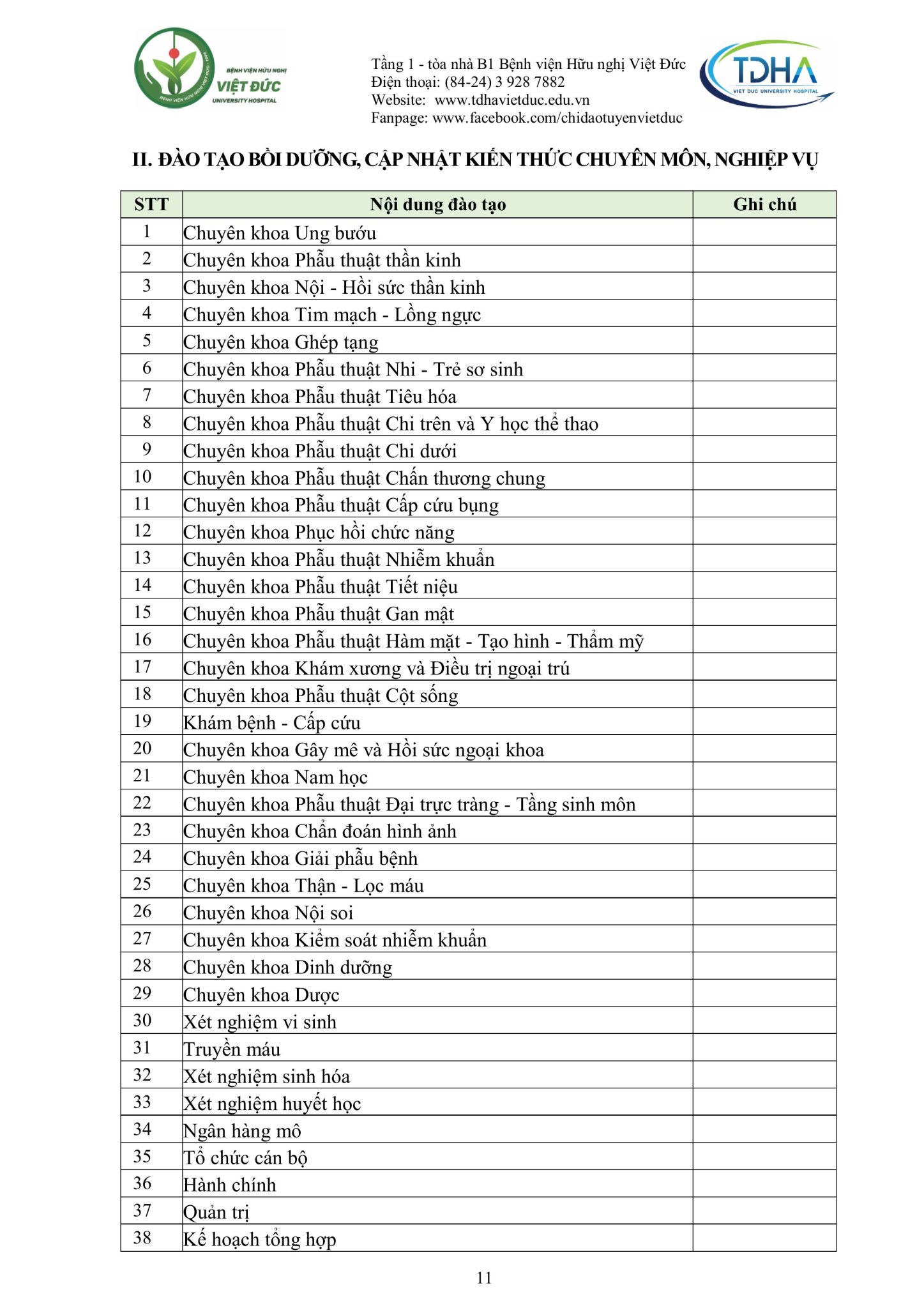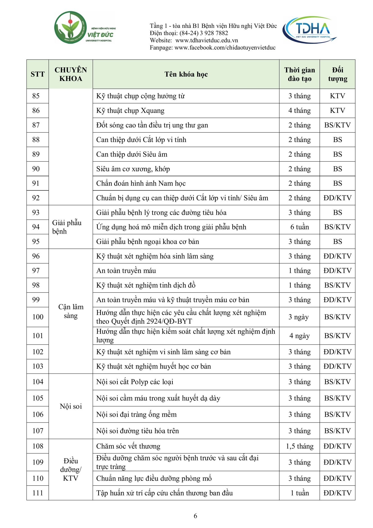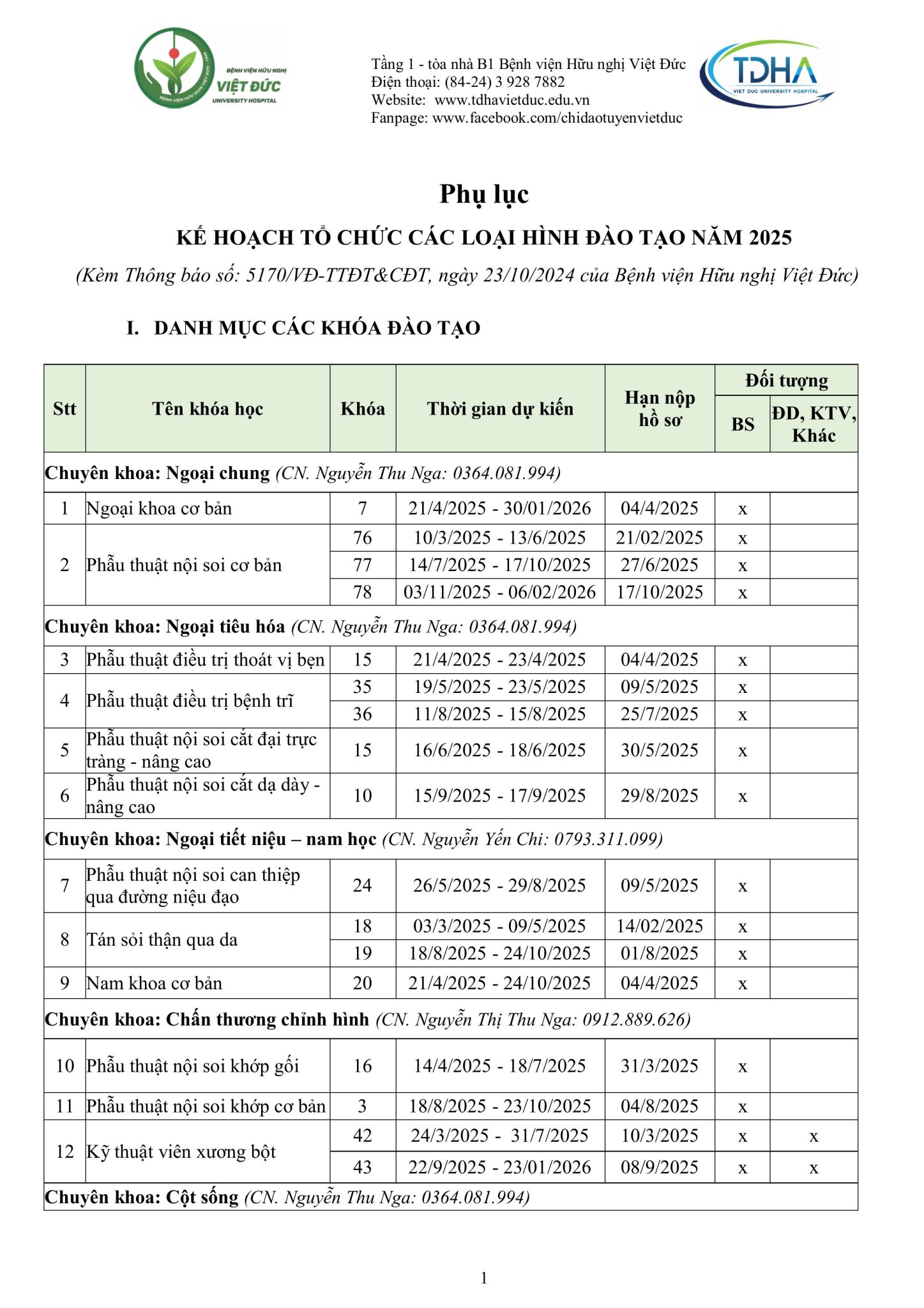 Nhằm trang bị kiến thức, kỹ năng, phương pháp điều trị mới cũng như chia sẻ kinh nghiệm thực tiễn và nâng cao trình độ chuyên môn từ cơ bản đến chuyên sâu cho các cán bộ y tế, đồng thời hỗ trợ các bệnh viện từng bước nâng cao chất lượng khám, chữa bệnh, Bệnh viện Hữu nghị Việt Đức trân trọng kính gửi Quý đơn vị/đồng nghiệp kế hoạch đào tạo liên tục năm 2025 (Phụ lục đính kèm).