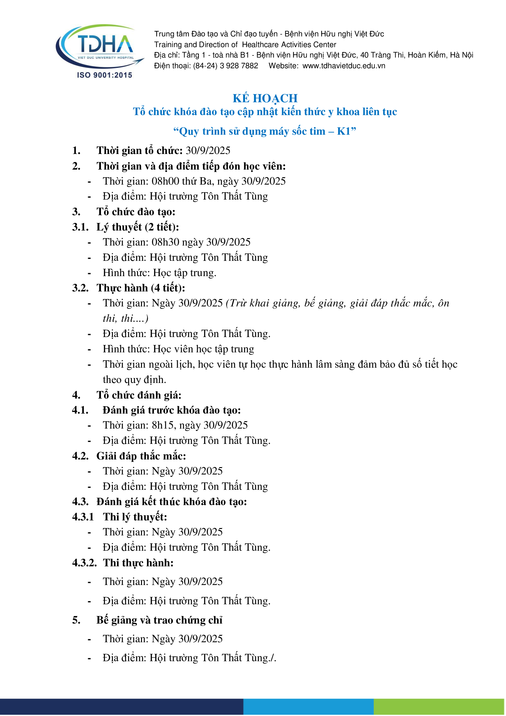 Để đáp ứng nhu cầu nâng cao trình độ chuyên môn của các cán bộ y tế đang làm việc tại Bệnh viện Hữu nghị Việt Đức. Ngày 30/9/2025 , Bệnh viện Hữu nghị Việt Đức tổ chức khóa đào tạo cập nhật kiến thức y khoa liên tục “Quy trình sử dụng máy sốc tim – K1”.