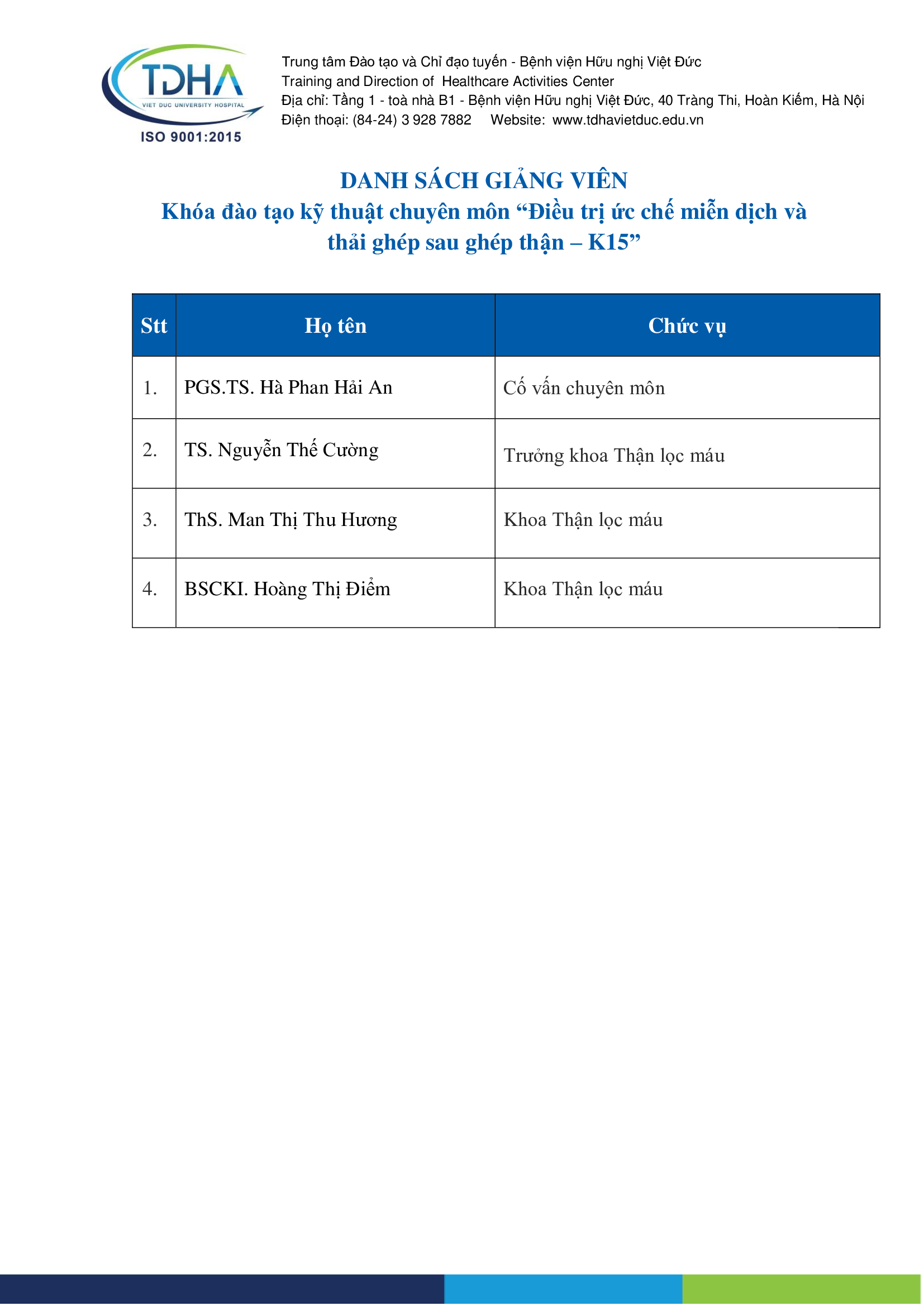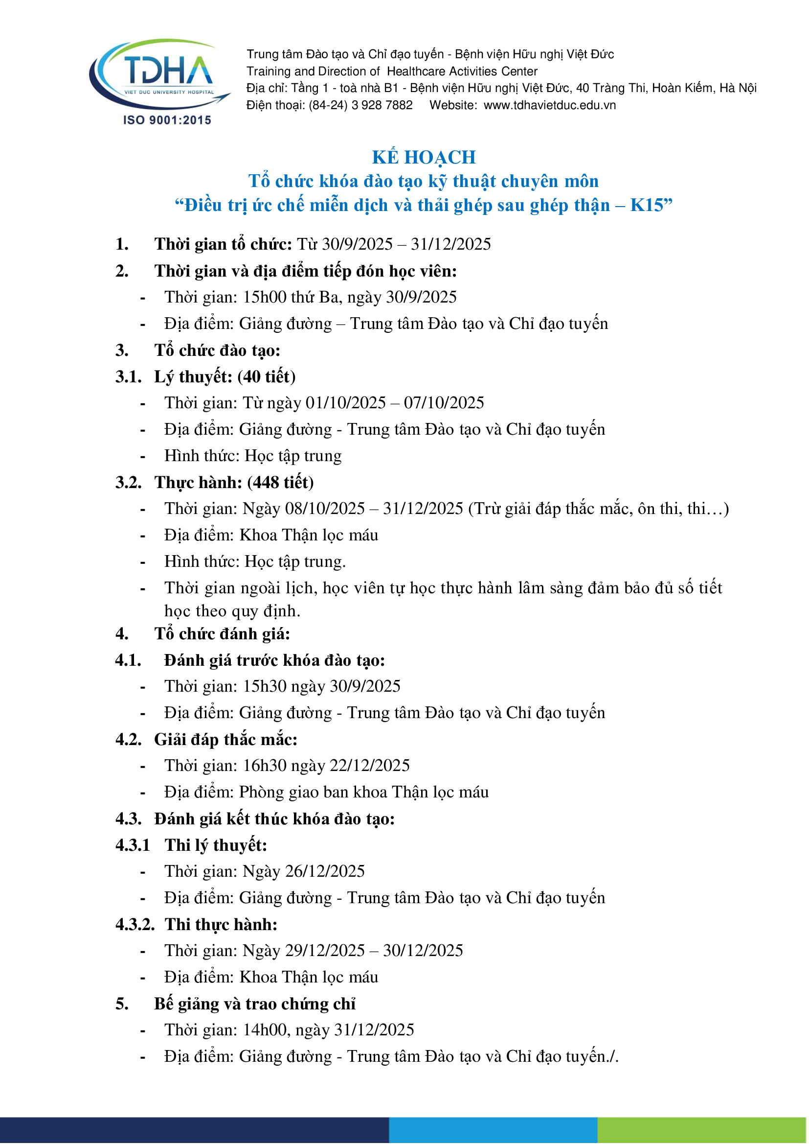 Để đáp ứng nhu cầu nâng cao trình độ chuyên môn của các cán bộ y tế đang làm việc tại Bệnh viện Hữu nghị Việt Đức và các đơn vị hoạt động trong lĩnh vực y khoa trên cả nước, từ tháng 9/2025 đến tháng 12/2025, Trung tâm Đào tạo và Chỉ đạo tuyến – Bệnh viện Hữu nghị Việt Đức tổ chức khóa đào tạo kỹ thuật chuyên môn Điều trị ức chế miễn dịch và thải ghép sau ghép thận – K15