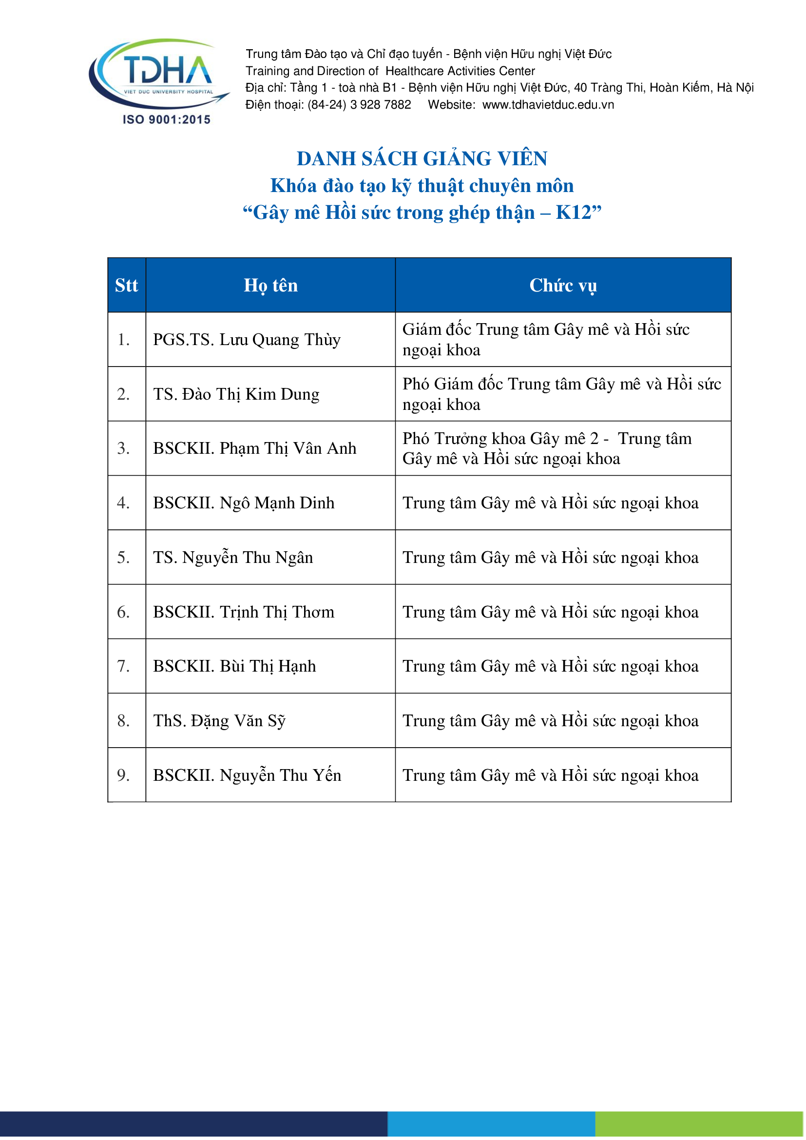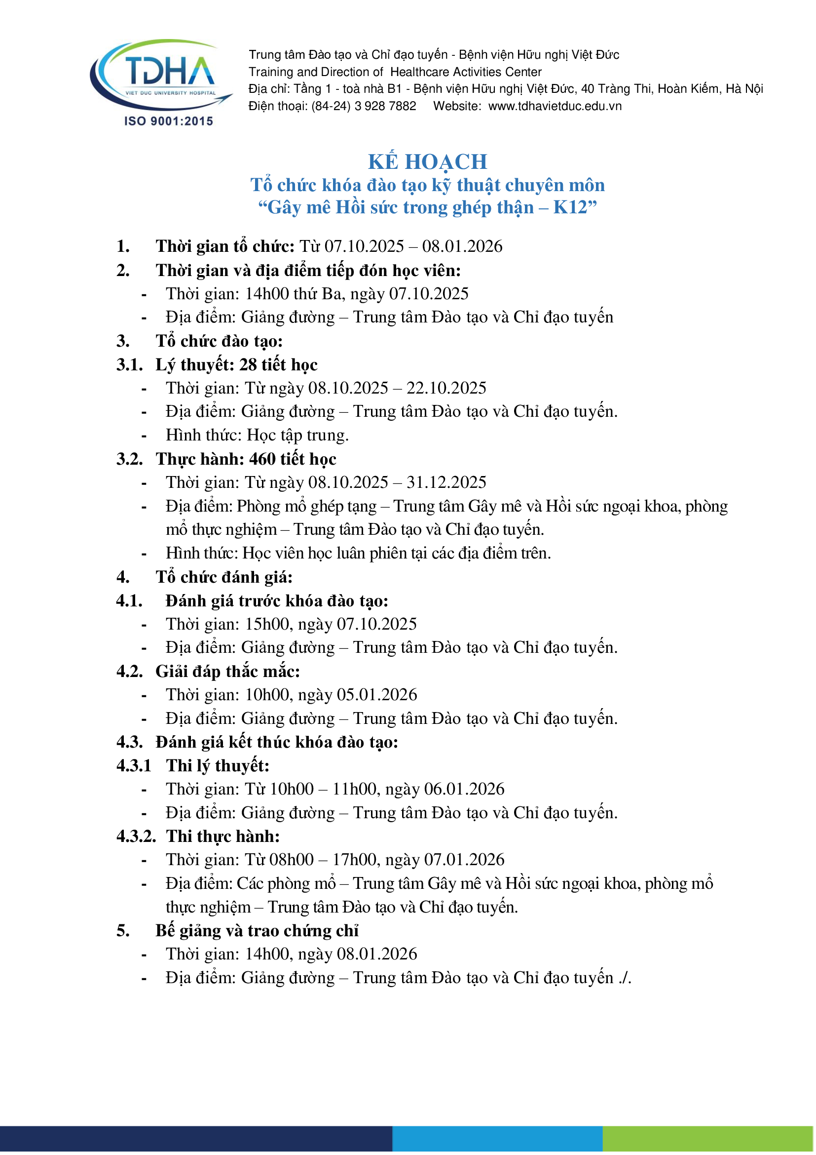 Để đáp ứng nhu cầu nâng cao trình độ chuyên môn của các cán bộ y tế đang làm việc tại Bệnh viện Hữu nghị Việt Đức. Từ tháng 10/2025 đến tháng 01/2026 , Bệnh viện Hữu nghị Việt Đức tổ chức khóa đào tạo kỹ thuật chuyên môn “Gây mê hồi sức trong ghép thận – K12”.